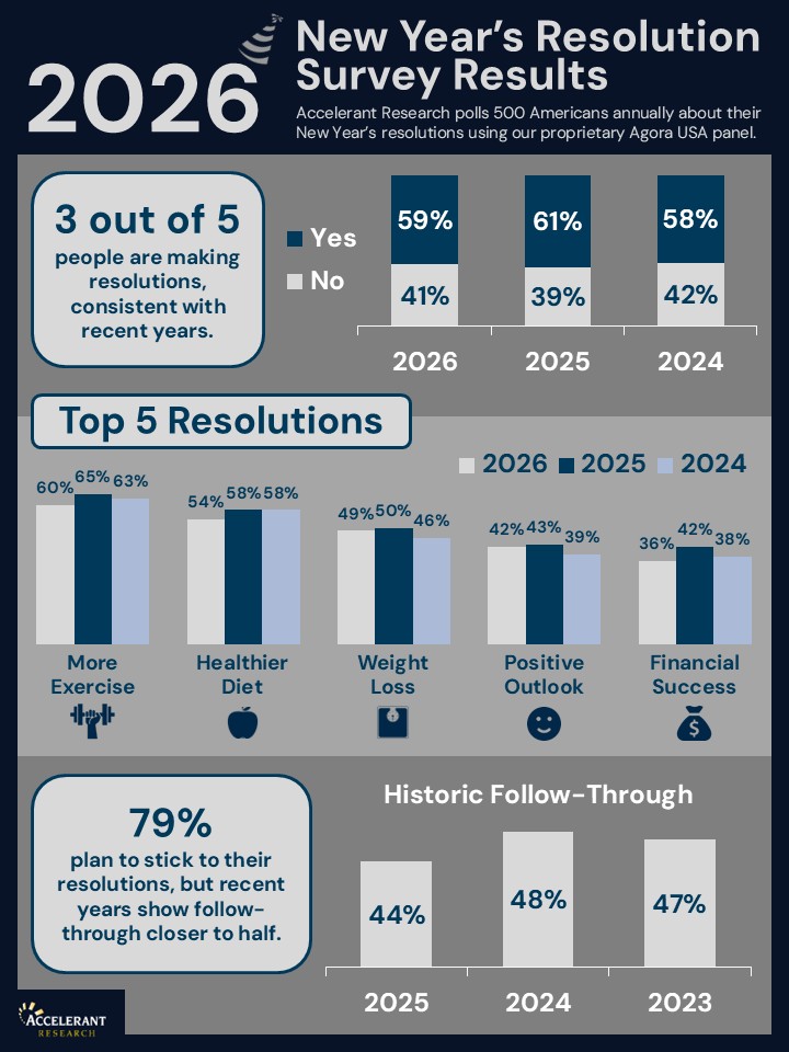 Happy New Year! 🥂 Using its proprietary Agora USA consumer insights community, Accelerant Research polled over 500 Americans about their 2026 New Year's resolutions. Check out our findings below!